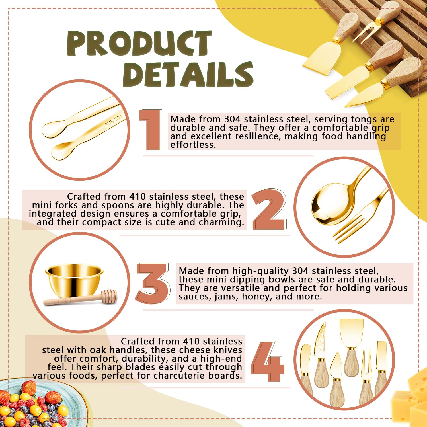 - 【Premium Materials and Advanced Technology】 The dipping bowls, serving tongs, fork and spoon are crafted from high-quality stainless steel with advanced integrated technology. The cheese knives and spreaders have stainless steel blades and oak wood handles, making them durable, wear-resistant and corrosion-resistant. Their mirror-polished surfaces are smooth, bright and easy to clean. Everyone will love them, they are your best choice.